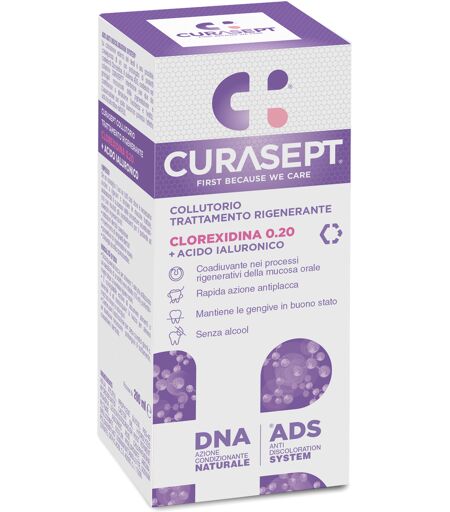 CURASEPT - COLLUTORIO TRATTAMENTO RIGENERANTE - Descrizione Collutorio rigenerante con Clorexidina 0.20, ADS e Acido ialuronico. Indicato nel trattamento per un'idratazione delle mucose con coseguente normalizzazione rapida delle lesioni. Contribuisce al successo delle procedure odontoiatriche. Ind… ...