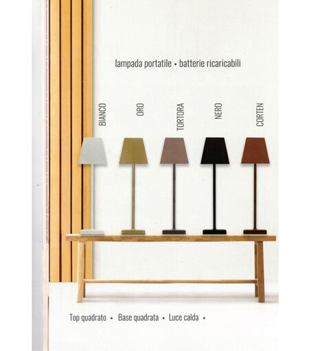 LAMPADA DA TAVOLO LED RICARICABILE TOUCH DIMMERABILE BAR RISTORANTE QUADRA PREQU' - Lampada da Tavolo Luce LED Calda 3,5W, 3000K, 220 Lumen , senza fili a Batteria ricaricabile da 3600 mAh tramite cavo USB.- Accensione e spegnimento tramite Tasto Touch. Funzione Dimmer tramite la semplice pressione del Tasto Touch.- Batteria ricaricabile tramite cavo USB-C in dotazione da 80 cm.- Ricarica Rapida in circa 4/5 ore. - Durata Batteria di 7/9 ore alla massima luminosità e 35/45 ore alla minima luminosità. - Design semplice ed elegante, Corpo in Alluminio, Base Antiscivolo.- Altezza 36 cm , Larghezza 11 cm .- Caricabatteria da 5V NON incluso.- Grado di Protezione IP54.- Ideale per Ristoranti, Dehor, Scrivanie, Tavoli da giardino, cene a lume di candela.- Adatto sia per Interni che per esterni.Colori disponibili: Bianco / Tortora / Nero / Corten N.B. SELEZIONARE IL COLORE DESIDERATO PRODOTTO DI QUALITA’ LA FATTURA VIENE EMESSA PER IMPORTI SUPERIORI A € 20 E VA RICHIESTA AL MOMENTO ...