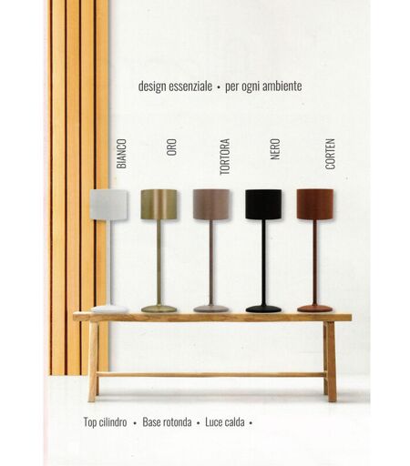 LAMPADA DA TAVOLO LED RICARICABILE TOUCH DIMMERABILE BAR RISTORANTE TONDA PREQU' - Lampada da Tavolo Luce LED Calda 3,5W, 3000K, 220 Lumen , senza fili a Batteria ricaricabile da 3600 mAh tramite cavo USB.- Accensione e spegnimento tramite Tasto Touch. Funzione Dimmer tramite la semplice pressione del Tasto Touch.- Batteria ricaricabile tramite cavo USB-C in dotazione da 80 cm.- Ricarica Rapida in circa 4/5 ore. - Durata Batteria di 7/9 ore alla massima luminosità e 35/45 ore alla minima luminosità. - Design semplice ed elegante, Corpo in Alluminio, Base Antiscivolo.- Altezza 36 cm , Larghezza 11 cm .- Caricabatteria da 5V NON incluso.- Grado di Protezione IP54.- Ideale per Ristoranti, Dehor, Scrivanie, Tavoli da giardino, cene a lume di candela.- Adatto sia per Interni che per esterni.Colori disponibili: Corten / Tortora N.B. SELEZIONARE IL COLORE DESIDERATO PRODOTTO DI QUALITA’ LA FATTURA VIENE EMESSA PER IMPORTI SUPERIORI A € 20 E VA RICHIESTA AL MOMENTO DELL'ACQUISTO ...