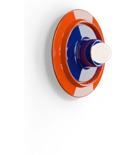 Collezione VOILÀ LA LUCE CHE PRENDE FORMA Applique da interno 1 luce E27 MAX 53W (non inclusa) in ceramica arancio volpe e blu robot. D.28 x P.10cm. Voilà rappresenta l'onomatopea del gesto finale del ceramista che estrae il pez zo dallo stampo. Realizzata tramite una pressatura avanzata della ceramica, per mette di ottenere spigolosità impossibili con le tecniche tradizionali, assemblando i due elementi concentrici (smaltati con colori a contrasto) alla perfezione. Ideale per montaggio a parete o a soffit to, illumina sia spazi medi che corridoi lunghi se usata in sequenza. ...