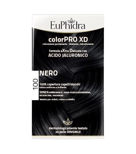 EuPhidra colorPRO XD 100 NERO Descrizione Colorazione permanente per capelli con formula extra delicata. Più prestazioni: l'acido ialuronico penetra nella fibra capillare e agisce dall'interno aumentando idratazione, lucentezza, morbidezza. Privo di resorcina, parabeni, ammoniaca, para-fenilen ...