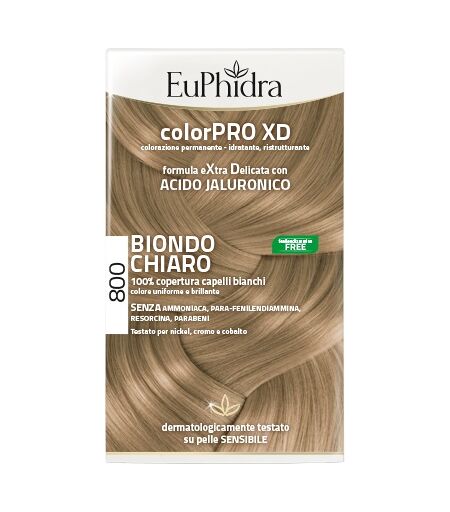 EuPhidra colorPRO XD - 800 BIONDO CHIARO - Descrizione Colorazione permanente per capelli con formula extra delicata. Più prestazioni: l'acido ialuronico penetra nella fibra capillare e agisce dall'interno aumentando idratazione, lucentezza, morbidezza. Non contiene resorcina, parabeni, ammoniaca, … ...