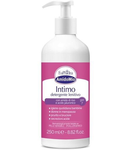 EuPhidra AmidoMio INTIMO DETERGENTE LENITIVO PH 7Descrizione Detergente liquido per l'igiene intima quotidiana in caso di fastidio intimo legato a secchezza e prurito, spesso collegati a menopausa e situazioni che comportano variazioni estrogeniche. Il pH 7 è utile anche per ristabilire l'equilibrio fisiologico in caso di bruciore e irritazioni legate a secrezioni acide. Amido di riso e acido ialuronico formano un microfilm lenitivo e idratante che dona sollievo da pruriti e fastidi. Olio di mandorle dolci e glicerolo vegetale hanno un effetto emolliente e riequilibrante contro la secchezza. Amido di riso: protettivo e calmante; Acido ialuronico e pantenolo: idratanti e lenitivi; Olio di mandorle dolci: nutriente ed emolliente; Glicerolo vegetale: emolliente e umettante. Senza SLES, SLS, parabeni, oli minerali. Senza coloranti, siliconi. Dermatologicamente testato su pelle sensibile. Testato per nichel, cromo, cobalto. Test di purezza microbiologica: libero da contaminazioni. Modalità d'uso Applicare il prodotto direttamente sulle zone interessate inumidite, o diluito nell'acqua del bidet. Risciacquare accuratamente. Uso esterno. Componenti Aqua (water), sodium myreth sulfate, acrylates copolymer, glycerin, oryza sativa (rice) starch, sodium hyaluronate, prunus amygdalus dulcis (sweet almond) oil, panthenol, cocamidopropyl betaine, hydroxyacetophenone, decylene glycol, polyquaternium-7, propanediol, parfum (fragance), sodium hydroxide. Formato Flacone con dispenser 250 ml Cod. VZEA061 ...
