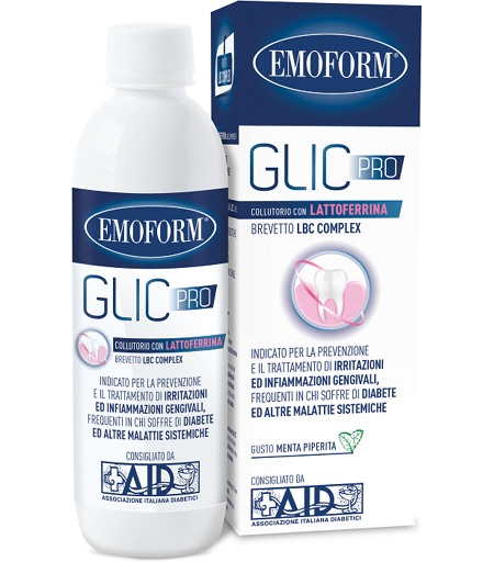 EMOFORM - GLIC PRO - Descrizione Dispositivo Medico. Collutorio indicato per la prevenzione ed il trattamento di irritazioni ed infiammazioni gengivali frequenti in chi soffre di diabete ed altre malattie sistemiche. Contiene lattoferrina. Con sistema brevettato LBC Complex una tecnologia sviluppa… ...