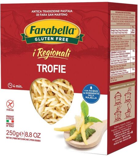 Farabella i Regionali Trofie - Pasta stabilizzata senza glutine, specificamente formulata per celiaci. Senza allergeni. Ingredienti Farina di mais, farina di riso, acqua, amido, sale. Correttore di acidità: acido lattico (E270). Conservante: acido ascorbico (E200). Tutti gli ingredienti sono di ori… ...
