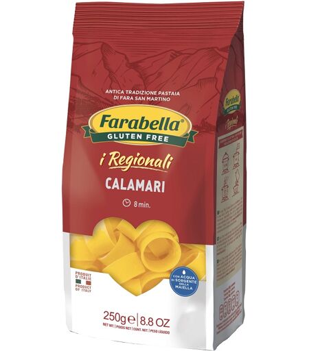 Farabella CALAMARI - Descrizione Pasta senza glutine. Ingredienti Farina di mais, farina di riso. Senza glutine. Caratteristiche nutrizionali Valori medi per 100 g Energia 350 kcal/1.500 kJ Proteine 6,4 g Grassi di cui acidi grassi saturi 1,4 g 0,2 g Carboidrati di cui zuccheri 78 g 1,5 g Fibra ali… ...