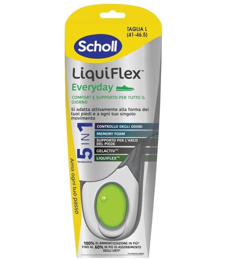 Scholl - LiquiFlex Everyday - Descrizione Solette progettate e sviluppate per ridurre la pressione eccessiva della camminata e delle attività quotidiane. Si adattano attivamente alla forma dei piedi e a ogni movimento. Con tecnologia 5 in 1: il tessuto superiore anti - odore protegge dagli odori; 1… ...