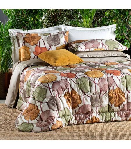 Trapunta Keira La trapunta Keira è un omaggio alla natura e ai suoi contrasti cromatici. I motivi floreali, resi vividi dalla stampa digitale su raso di cotone 300 fili, donano luminosità e profondità, mentre il retro in madapolam 100% cotone garantisce morbidezza naturale. L’imbottitura da 350 gr/m² assicura calore avvolgente e leggerezza, perfetta per l’inverno. La trapuntatura a capo con quadri, completata da cornice e angoli tondi, racconta una cura sartoriale che ne garantisce la durata. Con le dimensioni matrimoniali di 260x270 cm, Keira veste il letto con imponenza e fascino. Proposta nelle varianti Cumino e Quarzo, la trapunta non è solo un capo funzionale ma una creazione di qualità superiore, capace di trasformare la camera in uno spazio poetico e avvolgente. ...