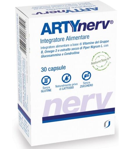 ARTYNERV - Descrizione Integratore alimentare a base di vitamine del gruppo B, omega - 3 (DHA ed EPA), acido lipoico, vitamina C e estratto fluido di Piper nigrum L. contiene inoltre glucosammina e condroitina, principali componenti della cartilagine articolare, e un estratto di gommoresine di mirr… ...