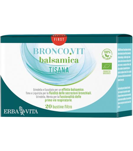 Broncovit Tisana Balsamica 12 Bustine Caratteristiche: Erba Vita Broncovit Tisana Balsamica è una miscela biologica ispirata alla tradizione erboristica, pensata per offrire sollievo durante i mesi freddi. Contiene estratti di Pino, Eucalipto e Menta dall’effetto balsamico, ideali per liberare le vie respiratorie. La Grindelia svolge un’azione emolliente sulle mucose orofaringee e supporta il tono della voce. Liquirizia, Anice verde, Issopo e Timo volgare favoriscono la naturale fluidificazione del muco bronchiale. Un rimedio naturale da gustare caldo, consigliato anche in abbinamento agli altri prodotti della linea Respirando. Misto di erbe balsamiche e lenitive 100% biologiche Con pino, eucalipto e menta per un’azione decongestionante Grindelia e timo per gola, voce e secrezioni bronchiali Ideale nei periodi invernali e in caso di mal di gola o tosse Senza zuccheri aggiunti, dolcificabile a piacere Contiene 12 bustine filtro – pronto all’uso FAQ Broncovit Tisana Balsamica: Quando è consigliato usare Broncovit Tisana? È ideale durante i mesi freddi o in caso di tosse, raucedine e irritazioni alla gola. Ottima anche per liberare le vie respiratorie. La tisana contiene ingredienti biologici? Sì, tutti gli ingredienti presenti nella Broncovit Tisana sono da agricoltura biologica certificata, senza OGM né pesticidi. Può essere usata anche dai bambini? Sì, ma si consiglia di consultare il pediatra prima dell’uso nei bambini sotto i 6 anni per dosaggio e tollerabilità. Qual è la posologia consigliata? Si consiglia di assumere 1-2 tazze al giorno, lasciando in infusione 1 bustina in acqua bollente per circa 5-7 minuti. Si può abbinare ad altri prodotti respiratori? Sì, Broncovit Tisana è pensata per agire in sinergia con altri prodotti della linea Respirando di Erba Vita per un effetto completo. ...