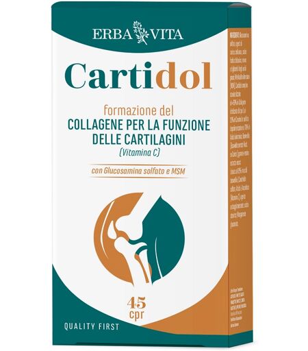 Cartidol - Descrizione Integratore alimentare a base di glucosamina, MSM, condroitin solfato, collagene idrolizzato di tipo II ed acido ialuronico. Con vitamina C che contribuisce alla formazione del collagene, costituente essenziale delle cartilagini, e con Boswellia utile per la funzionalità arti… ...