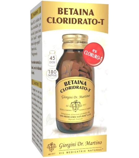 BETAINA CLORIDRATO - T - Descrizione Integratore di cloruro e betaina. Il cloruro favorisce la funzione digestiva mediante la normale produzione di acido cloridrico nello stomaco mentre la betaina contribuisce al normale metabolismo dell'omocisteina. L'effetto benefico si ottiene con l'assunzione g… ...