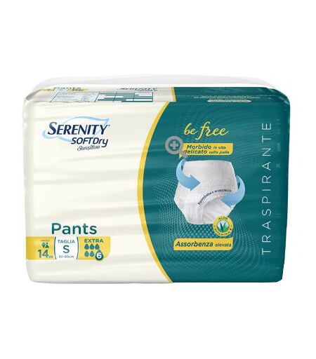 SERENITY - SoftDRY Sensitive - BE FREE - Pants EXTRA - Descrizione Mutandina assorbente con Odour Control adatto per un'incontinenza moderata/grave. Con fascia addominale rivestimento esterno traspirante e dermoprotezione all'Aloe. Discretto sotto i vestiti. Modalità d'uso 1.Infilare i Pants e so… ...