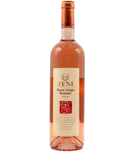 Il Pinot Grigio Zeni Fontane, , con la sua elegante e personale tonalità ramata, è un vino secco, sapido e di struttura equilibrata. L'uva, raccolta a mano, arriva in cantina intera, dove è pigiata, e pompata nei tini d'acciaio per una breve sosta di circa 12 ore a contatto con le bucce. Svinato, decantato, inizia la fermentazione primaria, rigorosamente controllata. Imbottigliato in primavera e, dopo un breve periodo di riposo, è posto in vendita. Il Pinot Grigio ramato non gradisce i lunghi invecchiamenti. Il suo profumo di pera matura va assaporato in giovinezza e, la sua gradevolezza al palato va colta tra una vendemmia e l’altra. Bottiglia 75 cl ...