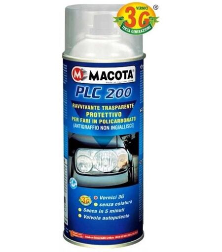 BOMBOLETTA DA 200 oppure 400ml Macota PLC 200 3G Ravvivante Protettivo Trasparente per fari in policarbonato. Vernice spray dall'alto potere di brillantezza Copre perfettamente piccoli graffi e garantisce un'ottima resistenza alle abrasioni e al lavaggio con detergenti. Non ingiallisce Una bomboletta può coprire una superficie di circa 1,5 - 2,0 m² e asciuga in 10 minuti. ANTIGRAFFIO - NON INGIALLISCE Macota presenta un prodotto dalla formula assolutamente speciale. Prodotto realizzato per policarbonato, in particolare per fari auto e moto. Alto potere di brillantezza. Non ingiallisce. Ottima resistenza anti graffio e al lavaggio anche con detergenti forti. Copre perfettamente i piccoli graffi. Asciuga in 10 minuti. E' consigliato pulire accuratamente la superficie prima di verniciare, togliere eventuali tracce di olio, grasso e silicone. In condizioni di bassa temperatura ed alta umidità, asciugare bene ed aiutarsi con un asciugacapelli, quindi applicare il prodotto con 2-3 passaggi ...