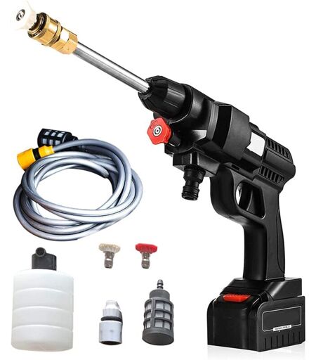 Potente pulitore ad alta pressione L'idropulitrice è dotata di una batteria al litio di grande capacità da 5600 mAh, sicura e durevole, con una durata della batteria fino a 40 minuti, potenza elevata a 12000 rpm. Sicuro e affidabile: potente motore in rame da 200 W, spegnimento automatico e start-stop Risparmia energia e prolunga la vita utile Il filtro a maglia fine in acciaio inossidabile incorporato filtra efficacemente le impurità nell'acqua Ugello rotante: l'ugello rotante può regolare le dimensioni del flusso d'acqua, il getto diretto ad alta pressione può pulire le macchie ostinate, lo spray a ventaglio può pulire ampie aree e lo spray per doccia può annaffiare i fiori Puoi attivare più funzioni a piacimento. quest idropulitore a pressione completa facilmente varie attività di pulizia. Adatto per la perfetta pulizia di rivestimenti, ponti, cemento, pavimenti, piscine, mobili da esterno, automobili, camion, cancelli, panchine, mobili e attrezzature da giardino, biciclette, ...