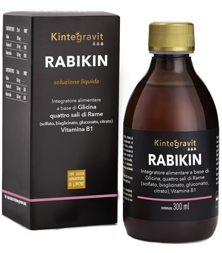 Kintegravit - RABIKIN - Descrizione Integratore alimentare a base di glicina, quattro sali di rame (solfato, bisglicinato, gluconato, citrato) e vitamina B1. Con succo concentrato di limone. Ingredienti Acqua, destrina resistente da mais (fibra solubile); addensante: carbossimetilcellulosa sodica; … ...
