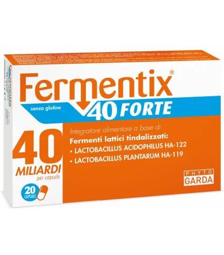 Fermetix-« 40 Forte PhytoGarda - Integratore AlimentareA base di Fermenti lattici tindalizzati LACTOBACILLUS ACIDOPHILUS HA-122 LACTOBACILLUS PLANTARUM HA-11940 MILIARDI per capsulaINGREDIENTILactobacillus acidophilus HA-122 tindalizzato*, Lactobacillus plantarum HA-119 tindalizzato*, capsula vegetale (idrossipropilmetilcellulosa), agenti di carica: mono e digliceridi degli acidi grassi; agenti antiagglomeranti: biossido di silicio, sali di magnesio degli acidi grassi.*contiene latte e derivati del latte, soia e derivati della soia.MODALIT+Ç D'USO1 capsula al giorno.AVVERTENZENon superare la dose giornaliera consigliata. Tenere fuori dalla portata dei bambini al di sotto dei 3 anni di età. Gli integratori alimentari non vanno intesi come sostituti di una dieta variata, equilibrata e di un sano stile di vita.FormatoConfezione con 20 capsule. ...