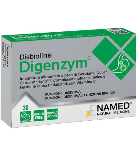 Disbioline Digenzym Descrizione Integratore alimentare a base di genziana, noce (funzione digestiva), cardo mariano (funzione digestiva ed epatica), complesso multienzimatico e fermenti lattici tindalizzati, con vitamina C. La presenza di zenzero, anice, noce e genziana favorisce le funzioni digestive. Il cardo mariano risulta utile per la funzione digestiva ed epatica. La camomilla svolge azione emolliente e lenitiva (sistema digerente). Ingredienti COMPRESSA A: complesso multienzimatico da substrati vegetali fermentati (alfa-amilasi 24.000 DU/g, proteasi 6.000 PC/g, cellulasi 1.100 CU/g, beta-D-galattosidasi 4.000 ALU/g, lipasi 200 FIP/g); agenti di carica: cellulosa, fosfato dicalcico; ippocastano (Aesculus hippocastanum L.) corteccia e.s. tit. 15% escina, cardo mariano [Silybum marianum (L.) Gaertn., lecitina di soia] frutto e.s., noce (Juglans regia L.) semi e.s., camomilla (Matricaria chamomilla L.) fiori e.s. tit. 1% apigenina; agenti antiagglomeranti: carbossimetilcellulosa sodica reticolata, biossido di silicio, sali di magnesio degli acidi grassi; genziana (Gentiana lutea L.) radice e.s., anice (Pimpinella anisum L.) frutto e.s. tit. 1% anetolo, zenzero (Zingiber officinale Rosc.) rizoma e.s. tit. 5% gingeroli. COMPRESSA B: complesso multienzimatico da substrati vegetali fermentati (alfa-amilasi 24.000 DU/g, proteasi 6.000 PC/g, cellulasi 1.100 CU/g, beta-D-galattosidasi 4.000 ALU/g, lipasi 200 FIP/g); agenti di carica: cellulosa, fosfato dicalcico; vitamina C (acido L-ascorbico), inulina, camomilla (Matricaria chamomilla L.) fiori e.s. tit. 1% apigenina; agenti antiagglomeranti: carbossimetilcellulosa sodica reticolata, biossido di silicio, sali di magnesio degli acidi grassi; Lactobacillus acidophilus HA-122 tindalizzato*, Lactobacillus casei HA-108 tindalizzato *. *contiene latte e derivati del latte, soia e derivati della soia. Senza glutine. Caratteristiche nutrizionali COMPRESSA A Valori medi per 1 compressa Cardo mariano e.s. 9,9 mg Complesso multienzimatico di cui alfa-amilasi proteasi cellulasi beta-D-galattosidasi lipasi 200 mg 23,6 mg (4.800 DU) 12,4 mg (1.200 PC) 5,78 mg (220 CU) 9 mg (800 ALU) 0,32 mg (40 FIP) Ippocastano e.s. di cui escina 33,3 mg 5 mg Noce e.s. 30 mg Camomilla e.s. di cui apigenina 30 mg 0,3 mg Genziana e.s. 20 mg Anice e.s. di cui anetolo 20 mg 0,2 mg Zenzero e.s. di cui gingeroli 10 mg 0,5 mg Caratteristiche nutrizionali COMPRESSA B Valori medi per 1 compressa Vitamina C 60 mg (75% VNR*) Complesso multienzimatico di cui alfa-amilasi proteasi cellulasi beta-D-galattosidasi lipasi 200 mg 23,6 mg (4.800 DU) 12,4 mg (1.200 PC) 5,78 mg (220 CU) 9 mg (800 ALU) 0,32 mg (40 FIP) Camomilla e.s. di cui apigenina 32 mg 0,32 mg Lactobacillus acidophilus HA-122 tindalizzato 1 mld cellule non vitali Lactobacillus casei HA-108 tindalizzato 1 mld cellule non vitali Inulina 36 mg *VNR: Valori Nutritivi di Riferimento Modalità d'uso Compressa A: 1 compressa al mattino o a pranzo. Compressa B: 1 compressa la sera.... ...