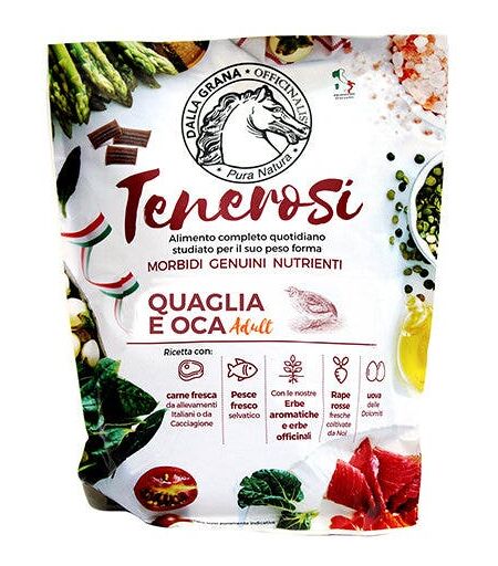 Crocchette Le crocchette semiumide I tenerosi di Pura Natura contengono solo ingredienti freschi non essiccati che mantengono inalterato il loro elevato valore nutrizionale. Si prepara una grande polpetta di carne o pesce, si uniscono tutti gli ingredienti freschi come frutta, verdura, uova sgusciate, erbe aromatiche ed officinali. Vengono aggiunti fiocchi di patate, piselli, olii naturali, carne disidratata, vitamine e sali minerali e si impreziosisce il tutto con una dolce e salutare nota di miele, yogurt e gel di fico d’india. Una cottura per pochi minuti a 110° ed ecco pronti i deliziosi Tenerosi: crocchette morbide e gustosissime. Vengono immediatamente confezionati in atmosfera protettiva senza utilizzare conservanti chimici I Tenerosi Dalla Grana Pura Natura Adult Quaglia e Oca sono realizzati con carne freschissima di quaglia e oca garantite dall’azienda Quaja Veneta di Malo (Vicenza), che alleva a terra nel pieno rispetto dell’animale. Le carni di Oca e Quaglia sono molto ...