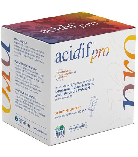 acidif pro - Descrizione integratore alimentare a base di L - metionina, condroitin solfato, acido ialuronico e fermenti lattici vivi. I fermenti lattici favoriscono l'equilibrio della flora batterica intestinale. Ingredienti L - metionina, acido ialuronico, condroitin solfato, Lactobaillus plantar… ...