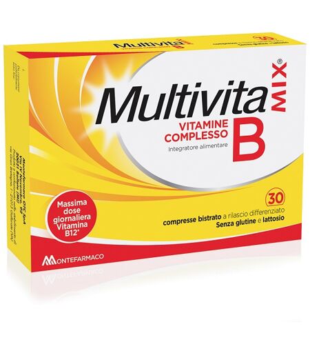 MULTIVITA B MIX Descrizione Multivitamix Vitamine Complesso B con alto contenuto di Vitamina B12 contiene le vitamine del gruppo B che contribuiscono: - alla riduzione di stanchezza e affaticamento (acido pantotenico; riboflavina; B6; B12; acido folico, niacina); - al normale metabolismo energetico (acido pantotenico; riboflavina; B6; B12; biotina; niacina; tiammina); - al buon funzionamento del sistema immunitario (vitamina B12, B6 e acido folico). La sua forma in compressa bistrato, è stata studiata per differenziare il rilascio della vitamina B12 durante la giornata. Ingredienti Agenti di carica: cellulosa, fosfato dicalcico, idrossipropilmetilcellulosa; niacina (nicotinamide); agenti antiagglomeranti: biossido di silicio, sali di magnesio degli acidi grassi; acido pantotenico (D-pantotenato, calcio); colorante: ossidi di ferro e idrossidi di ferro; vitamina B6 (cloridrato di piridossina); tiammina (cloridrato di tiammina); vitamina B2 (riboflavina); vitamina B12 (cianocobalamina); acido folico (acido pteroilmonoglutammico); biotina (D-biotina). Senza glutine e senza lattosio. Caratteristiche nutrizionali Contenuti medi per dose massima giornaliera (1 compressa) %VNR**/dose Tiammina 1,1 mg 100% Riboflavina 1,4 mg 100% Niacina 16 mg 100% Acido pantotenico 6 mg 100% Vitamina B6 1,4 mg 100% Acido folico 200 mcg 100% Vitamina B12 1.000 mcg* 40.000% Biotina 50 mcg 100% * Apporto giornaliero massimo per la Vitamina B12 previsto dalle relative linee del Ministero della Salute ** VNR: Valore Nutritivo di Riferimento Modalità d'uso Assumere 1 compressa al giorno, preferibilmente al mattino. Avvertenze Non superare la dose giornaliera consigliata. Tenere fuori dalla portata dei bambini al di sotto dei 3 anni di età. Gli integratori alimentari non vanno intesi come sostituti di una dieta variata, equilibrata e di uno stile di vita sano. Conservazione Conservare in luogo fresco e asciutto. Il termine minimo di conservazione si riferisce al prodotto correttamente conservato, in confezione integra. Validità a confezionamento integro: 24 mesi. Formato 30 compresse a rilascio differenziato Peso netto 15 g Cod. 04550 ...