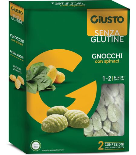 GIUSTO SENZA GLUTINE GNOCCHI con spinaci Ingredienti Patate reidratate 70% (acqua, fiocchi di patate; emulsionante: mono- e digliceridi degli acidi grassi; aromi) farina di mais, fecola di patate, amido di mais, spinaci 3%, farina di riso, sale; correttore di acidità: acido lattico; conservante: acido sorbico. Senza glutine, lattosio, uova, soia, arachidi, lievito e olio di palma. Caratteristiche nutrizionali Valori medi per 100 g Energia 703 kJ/165 kcal Grassi di cui acidi grassi saturi 0,0 g 0,0 g Carboidrati di cui zuccheri 37 g 0,1 g Fibre 0,0 g 0,0 g Proteine 3,5 g Sale 1,4 g Modalità d'uso Cuocere in abbondante acqua bollente precedentemente salata: quando gli gnocchi affiorano attendere 1 - 2 minuti e quindi scolare e servire. Conservazione Conservare a temperatura ambiente. Validità a confezionamento integro: 12 mesi. Formato Confezione contenente 2 buste da 250 g. Peso netto: 500 g. Cod. 0165P006 ...
