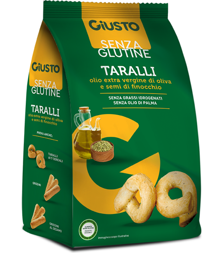 GiUSTO SENZA GLUTINE TARALLI Descrizione Taralli con olio extra vergine di oliva e semi di finocchio. Fonte di fibre. Ingredienti Vino bianco 22%, farina di riso, fecola di patate, amido di riso, olio di semi di girasole alto-oleico, amido di mais, olio extravergine d’oliva 3%, semi di finocchio 2%, sale; addensante: gomma di guar; polvere lievitante (agenti lievitanti: difosfato disodico, carbonato acido di sodio; amido di mais), destrosio monoidrato; addensante: gomma di xanthan; emulsionante: lecitina di girasole; estratto naturale d’oliva 0,01%. Contiene anidride solforosa e solfiti. Senza glutine, lattosio, uova, soia, arachidi, grassi idrogenati, olio di palma. Caratteristiche nutrizionali Valori medi per 100 g Energia 2.234 kJ/536 kcal Grassi di cui acidi grassi saturi 32 g 3 g Carboidrati di cui zuccheri 59 g 0,7 g Fibre 2,9 g Proteine 1,1 g Sale 2,4 g Conservazione Conservare a temperatura ambiente. Validità confezionamento integro: 9 mesi. Formato 40 g. Cod. 0509P010 ...