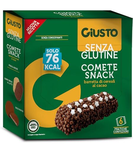 GIUSTO SENZA GLUTINE - COMETE SNACK - Descrizione Barrette di cereali al cacao, ad alto contenuto di fibre. Senza conservanti e grassi idrogenati. Ingredienti Palline di cereali al cacao 36% (farina di mais, farina di riso, cacao in polvere 5%), inulina, cioccolato fondente 22% (pasta di cacao, zuc… ...