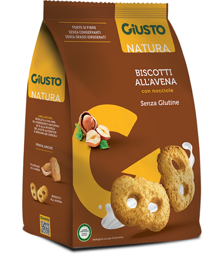 GIUSTO - BISCOTTI ALL'AVENA - con nocciole - Descrizione Biscotti all'avena con nocciole. Fonte di fibre. - Ingredienti Zucchero, farina integrale di avena senza glutine 27%, farina di riso, uova, olio di girasole, nocciole 4%, fiocchi di avena senza glutine 3%, sale, burro di cacao; agenti lievita… ...