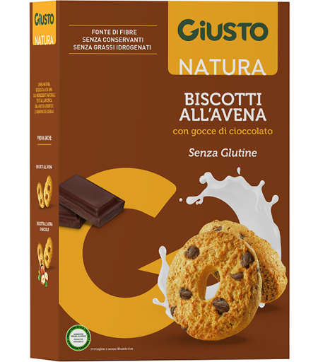 GIUSTO NATURA - BISCOTTI ALL'AVENA - con gocce di cioccolato - Descrizione Biscotti all'avena con gocce di cioccolato. Fonte di fibre. - Ingredienti Farina integrale di avena senza glutine 27% farina di riso zucchero gocce di cioccolato 9% (zucchero pasta di cacao; emulsionante: lecitina di soi… ...