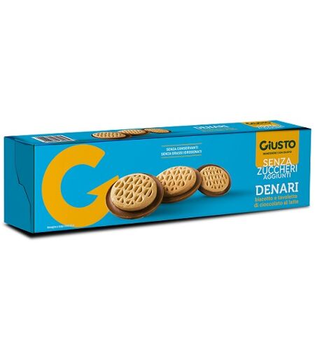 GIUSTO SENZZUCCHERI AGGIUNTI - DENARI - Descrizione Biscotto e tavoletta di cioccolato al latte. - Ingredienti Cioccolato di copertura al latte con edulcorante 50% (edulcorante: maltitolo; burro di cacao, latte intero in polvere, pasta di cacao; emulsionante: lecitina di soia; aroma naturale di van… ...