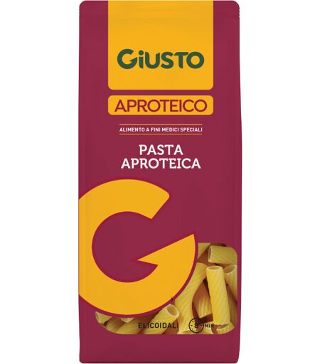 GiUSTO APROTEICO Descrizione Pasta aproteica. Elicoidali. Ingredienti Amido di mais, inulina, psyllium, emulsionante: mono e digliceridi degli acidi grassi; colorante: cartamo. Senza glutine, lattosio, uova e senza olio di palma. Caratteristiche nutrizionali Valori medi per 100 g Energia 1.460 kJ/345 kcal Grassi di cui acidi grassi saturi 1,3 g 0,9 g Carboidrati di cui zuccheri 79 g 0,3 g Fibre 6,9 g Proteine di cui fenilalanina tirosina 0,7 g 12 mg 10 mg Sale di cui sodio potassio fosforo 0,15 g 61 mg 46 mg 15 mg Cottura 8 minuti. Avvertenze Da utilizzare sotto il controllo del medico, che potrà stabilire la corretta dose del prodotto, in base all'età, il peso o la condizione medica del paziente. Il prodotto non è adatto per essere utilizzato come unica fonte di nutrimento; il ridotto contenuto di aminoacidi essenziali potrebbe comportare possibili rischi per la salute quando consumato da chi non presenta la malattia, il disturbo o la condizione medica cui il prodotto si prefigge di far fronte. Conservazione Conservare in luogo fresco e asciutto. Validità confezionamento integro: 36 mesi. Formato 250 g. Cod. 2398P006 ...