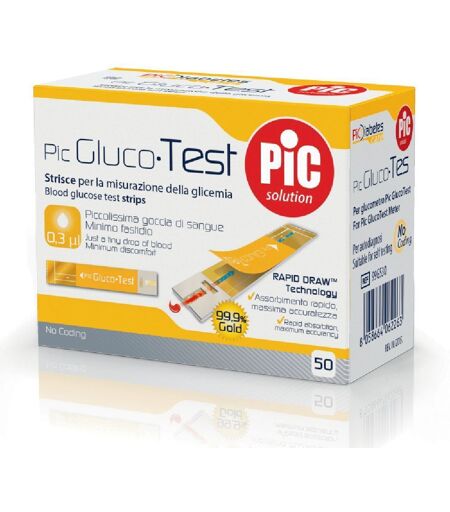 Pic Solution Misura Strisce Glucotest Strisce per la misurazione della glicemia. Per glucometro Pic Gluco Test. Piccolissima goccia di sangue: 0,3 µl. Minimo fastidio. Assorbimento rapido, massima sicurezza.Contenuto: 50 strisce reattive. ...