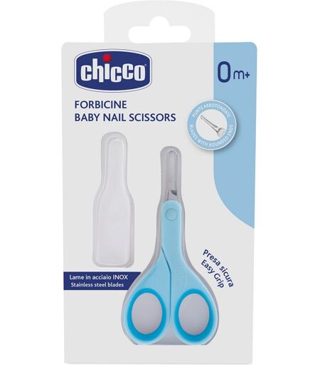 CHICCO - baby nail scissors - Le forbicine realizzate in acciaio inox e senza nichel hanno lame ricurve e punte arrotondate per una maggior sicurezza durante l'uso. Il cappuccio di protezione protegge igienicamente le lame. Colore: azzurre. Cod.0000591220000 ...