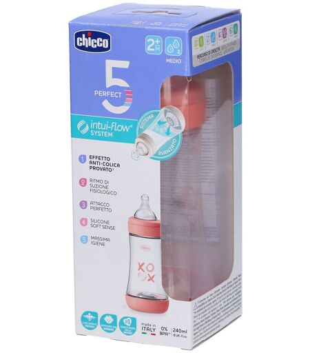 Chicco Biberon P5 Silicone Girl Rosa 240 mlPerfect 5 è il biberon biofunzionale: la rivoluzione degli anti-colica. Perfect 5 intuisce i bisogni di ogni bambino, adattandosi immediatamente e continuamente al suo ritmo di suzione fisiologico, garantendo un effetto anti-colica provato e il massim ...