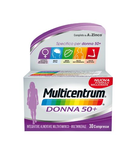 Multicentrum Donna 50+ - Descrizione Integratore alimentare multivitaminico e multiminerale completo appositamente formulato per supportare le esigenze nutrizionali delle donne dopo i 50 anni. Con alto contenuto di vitamina D formula completa e bilanciata qualità testata senza zuccheri. Le spec… ...