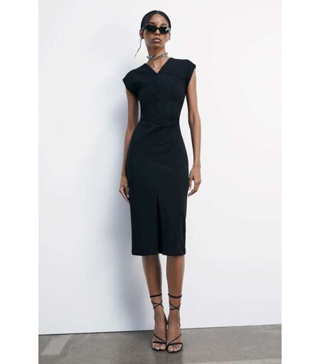 Abito midi smanicato con scollo a V, dal design sofisticato di ispirazione sartoriale. Realizzato in tessuto morbido e naturalmente resistente alle pieghe, scolpisce la silhouette con un drappeggio che enfatizza busto e punto vita. Lo spacco centrale profondo e la chiusura a zip sul retro donano comfort e praticità a un modello senza tempo. ...
