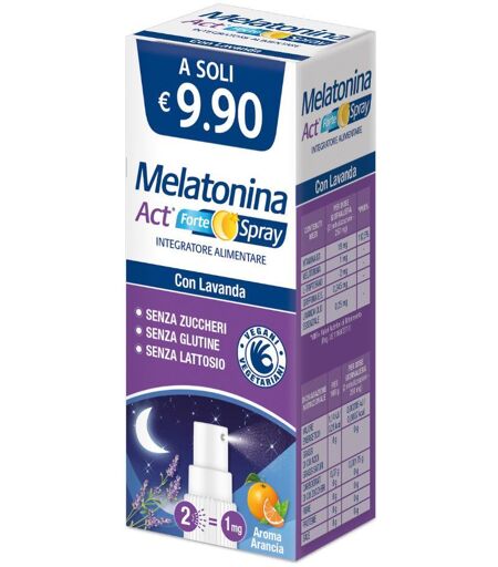 Melatonina Act Forte Spray - Descrizione Integratore alimentare a base di melatonina, triptofano, Griffonia e vitamina B3. La melatonina contribuisce alla riduzione del tempo richiesto per prendere sonno. La Griffonia favorisce il rilassamento ed il sonno. L'effetto benefico si ottiene con l'assunz… ...