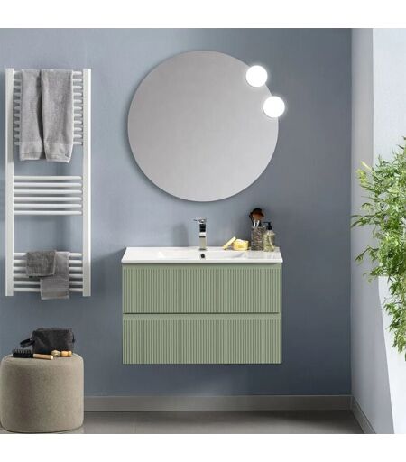 Mobile sottolavabo con due cassetti soft-close,vasca integrata in ceramica e specchio tondo 80 cm Declinate in diverse misure e finiture,la linea Giava propone soluzione pratiche e compatte di mobili bagno caratterizzati dal frontale cannettato in legno MDF ,un effetto millerighe e chiaroscuro che rende luminoso qualsiasi arredo bagno. La base portalavabo dispone di 2 cassettoni soft-close con elegante apertura a gola e il primo sagomato internamente per il sifone di scarico. Giava include lavabo in ceramica e specchio tondo a filo ,con la possibilità di impreziosire la composizione bagno con eleganti applique LED. Mobile bagno sospeso 100 cm verde salvia cannettato caratteristiche tecniche: Tipologia:mobile bagno sospeso; Linea:Giava; Materiale:MDF; Finitura:salvia opaco; Dimensioni mobile:L 101 x p 47 x H 51,4 cm; Dimensioni lavabo:L 101 x p 46,5 x H 16,4 cm; Dimensioni specchio:Ø 80 cm,spessore 0,4 cm; 2 cassettoni con frontale cannettato e alloggio sifone; Apertura incassata a ...