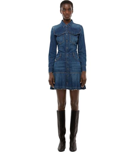 Mini abito a maniche lunghe realizzato in denim di cotone con lavaggio vintage medio.Con un classico stile a cinque tasche con passanti per cintura, la gonna presenta un orlo a balza con bordo grezzo.Impreziosito da impunture color tabacco e profili in pelle.Caratteristiche:- Stile a cinque tasche con passanti per cintura.- Chiusura completa con bottoni.- 2 tasche con patta.- Orlo a balza con bordo grezzo.- Carré posteriore.Specifiche:- 100% Cotone. ...