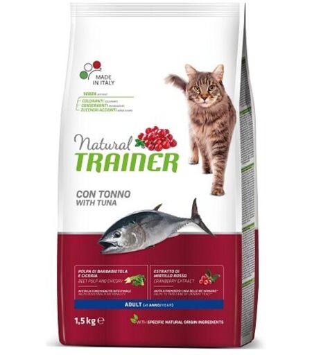 Natural Trainer Adult, prodotto con tonno e ingredienti funzionali come la mentuccia o il mirtillo rosso, è la fonte di energia di cui il vostro gatto adulto ha bisogno ogni giorno. La carne fresca di pollo e tacchino consente di offrire un alimento altamente appetibile e dall’ottimale profilo proteico, ideale per un vero carnivoro. La moderna formulazione rende ora possibile assecondare l’istinto ancestrale del gatto a cambiare gusto alternando le diverse referenze “Adult” in tutta libertà e sicurezza, senza effettuare un passaggio graduale (Trainer® Safe Transition). Gli estratti secchi di Propoli, Menta piperita e di mela (AppleZin™) aiutano a mantenere una corretta igiene orale. L’estratto di Mirtillo rosso ed il contenuto apporto di Fosforo e Magnesio aiutano a preservare nel tempo la funzionalità delle vie urinarie. Per il benessere della cute e la bellezza del manto la ricetta è arricchita con zinco, biotina e alga schizochytrium; mentre il lievito di birra ed i prebiotici ...