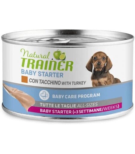 Alimento completo ed equilibrato per cuccioli da svezzare a partire da 3 settimane. Composizione Fegato di maiale, tacchinio 4% , cuore di maiale, olio di girasole, amido di patate, proteine idrolizzate di maiale, sostanze minerali, proteine del latte 0,5% , amido di granturco modificato, proteina di pisello, farina di riso fermentato, estratto secco di agrumi (bioflavonoidi)* 0,1% , estratto secco di mela* 0,1% . *ingredienti specifici di origine naturale Additivi/kg - additivi nutrizionali Vitamina: d₃ 200ui, e 15mg; taurina 700 mg, solfato di zinco monoidrato (68,5 mg)(zinco 25 mg), solfato di rame pentaidrato (4,9mg)(rame 1,25 mg). Componenti analitici Umidità 88,00% ; proteina grezza 4,5% ; grassi grezzi 3,5% ; fibra grezza 0,25% ; ceneri grezze 0,5% . Istruzioni per l’uso Razione giornaliera: consultare la guida per l'alimentazione, mescolare con l'alimento secco natural trainer baby starter. Servire in 2 o più pasti, a temperatura ambiente. Conservare in ...