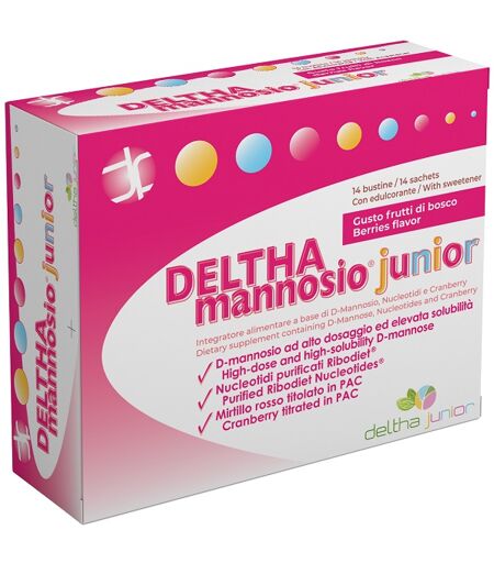 DELTHA mannosio junior - Descrizione Integratore alimentare a base di D - mannosio, nucleotidi e cranberry. Il cranberry favorisce il drenaggio dei liquidi corporei e la funzionalità delle vie urinarie. Ingredienti Maltodestrine, D - mannosio, aroma; agente acidificante: acido citrico; Ribodiets - … ...