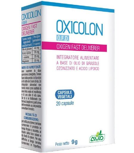 Gli integratori non sostituiscono un’alimentazione equilibrata e variegata e uno stile di vita sano. Integratore alimentare di olio di girasole ozonizzato (Remediozon) e acido lipoico, opportunamente formulato per esplicare un effetto protettivo a livello della mucosa intestinale, tale da migliorare l’assorbimento dei nutrienti e favorire la naturale eliminazione dei gas intestinali. Proprietà: Immunomodulatore sistemico - attivatore dei sistemi antiossidanti immunomodulatore locale disinfettante intestinale. Ingredienti: Magnesio ossido; Olio di girasole ozonizzato (Remediozon®); Acido lipoico; L- Cisteina; Antiagglomeranti: calcio carbonato, silice micronizzata; Capsula vegetale: idropssipropilmeticellulosa; titanio biossido, ossido di ferro giallo. Analisi media Per 1 capsula (dose giornaliera) Olio di girasole 42 mg Acido lipoico 35 mg L-cisteina 35 mg Magnesio 30 mg Modo d'uso:1 capsula al mattino prima di colazione Avvertenze: Non superare la dose giornaliera raccomandata.Tenere fuori dalla portata dei bambini al di sotto dei tre anni. Conservazione: Conservare in luogo fresco ed asciutto al riparo dalla luce, dalle fonti di calore localizzate e dai raggi solari ed evitare il contatto con l’acqua. Contenuto netto:20 capsule= 9 g Produttore:AVD Reform B.go San Biagio, 9 ParmaItalia ...