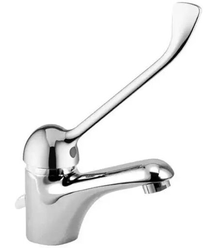 Miscelatore monocomando per lavabo a leva clinica. Corpo in ottone cromato, con bollino rosso e blu per agevolare la regolazione della temperatura dell'acqua. Adatto per completare l'ambiente bagno di un locale pubblico. Leva clinica robusta ed elegante, per agevolare l'utilizzo del rubinetto ancheda parte di utenti disabili o con ridotte capacità motorie. Per la puliziautilizzare esclusivamente detergenti al sapone neutro. Non utilizzare disinfettanti domestici o prodotti per la pulizia dei prodotti ceramici, detergenti abrasivi, corrosivi e contenenti alcool, acido cloridrico, acido solforico o acidi in generale. ...