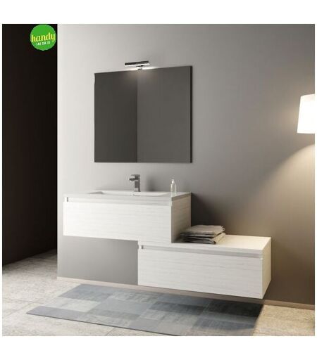 composizione da bagno sospesa realizzata in mdf ricoperta in polimerico. Mobile da bagno compatto e forte che assicura la massima praticità nell'uso quotidiano. Colore bianco frassino composto da doppio cassettone L.cm90xH.cm32xP.cm46,con specchio dimensioni L.80cm x H.70cm, lavabo in ceramica e applique Con possibilità di essere montato in maniera sfalsata. Rubinetteria e piletta non incluse ...