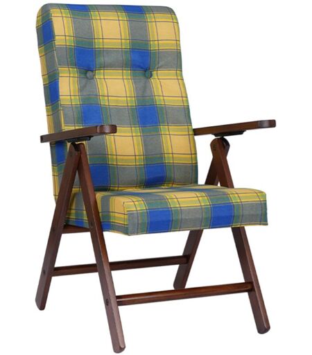 Poltrona sdraio Molisana in legno,schienale reclinabile in 4 posizioni,rivestita in tessuto.Struttura resistente e seduta comoda,che garantisce un buon sostegno senza far sprofondare il corpo. Poltrona realizzata interamente in faggio, imbottitura sagomati di poliuretano espanso. Adatta per qualsiasi ambiente della casa. CARATTERISTICHE Colore: Blu Scozzese Colore della struttura: Noce Materiale: Legno di faggio,policotone Tipologia: Poltrona reclinabile Dimensioni: Larghezza: 60 cm / Profondita' 67 cm / Altezza: 109 cm Peso: 12 kg Imbottito: Si Sfoderabile: No Reclinabile: 4 posizioni Altezza seduta compreso cuscino: 50 cm Profondita' seduta: 50 cm Altezza schienale: 67 cm Spessore cuscino seduta: 11 cm Spessore cuscino schienale: 14 cm Peso supportato: 110 kg max ...