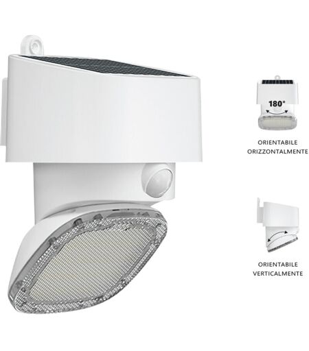 Faretto a led solare multifunzione e orientabile orizzontalmente e verticalmente da 2000lm con una batteria fino a 48h di autonomia. Dove posso utilizzare il faretto a led con pannello fotovoltaico integrato a batteria? È adatto per essere utilizzato negli ambienti dove non arriva la corrente elettrica. Utile all'esterno per illuminare piccole aree, giardini, oppure in campeggio con la tenda o con il camper. Molto luminoso alla massima potenza. Funzionamento: • Modalità M1: quando viene impostata questa modalità l'indicatore luminoso lampeggia una volta. Se la luce ambientale è superiore alla soglia del sensore crepuscolare, il proiettore rimane spento. Quando la luce ambientale si riduce sotto la soglia del sensore crepuscolare il proiettore si accende con un flusso luminoso di 50lm. Quando il sensore PIR rileva dei movimenti il proiettore aumenta il flusso luminoso a 2000lm. La luce emessa dal proiettore ritorna a 50lm se il sensore PIR non rileva movimenti per almeno 10 secondi. • ...