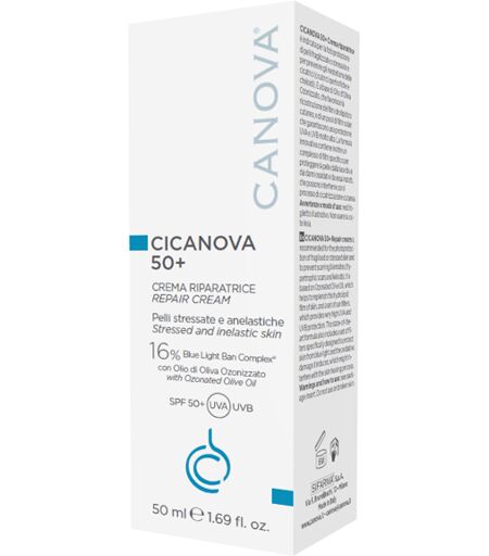 CICANOVA 50+ - Descrizione Crema riparatrice indicata per la foto - protezione di pelli fragili o stressate e per prevenire gli inestetismi delle cicatrici (cicatrici ipertrofiche e cheloidi). È a base di olio d'oliva ozonizzato, che favorisce la ricostruzione del film idrolipidico cutaneo, e di un… ...